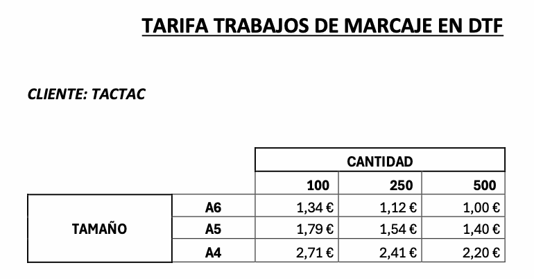 MARCAJE EN DTF: tenemos un proveedor nuevo, aún no lo testamos pero nos interesa para hacer los DTF. hay que contar los portes de ida y vuelta.